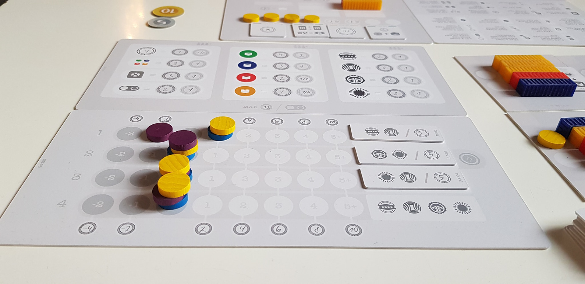 Between 2020 and 2022 I've conducted around 40 playtests in all player counts, iterating on the go between sessions. I created this system of modifying values very easily by erasing individual values from the boards and rewriting new ones without needing to reprint the whole prototype. That was possible by printing the prototype with empty place holders on a special PVC material, which allowed for easy erasing and rewriting. But most importantly, this allowed me to do faster game economy balancing on the go, which proved to be very helpful in the long run.